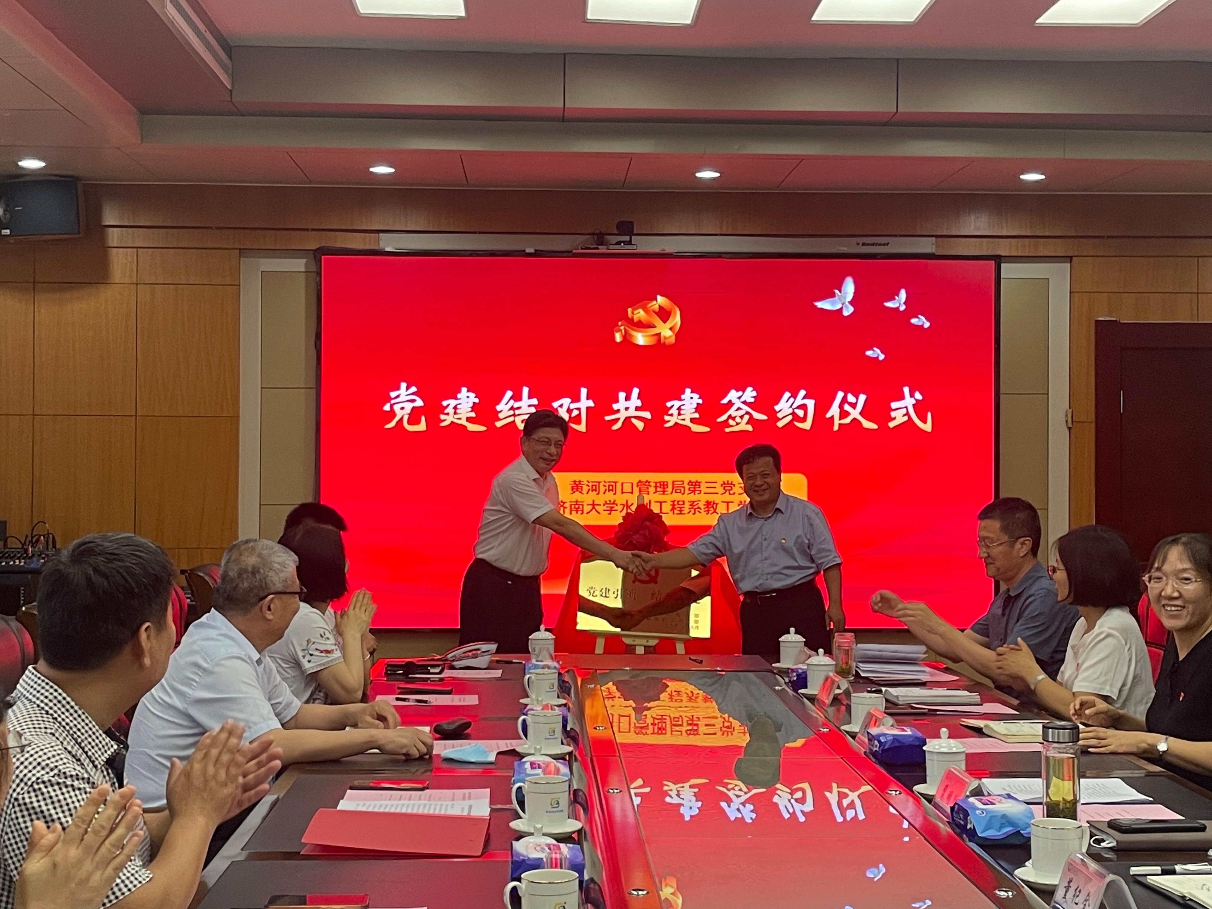黄河河口管理局第三党支部与VSport体育水利工程系教工党支部开展共建签约揭牌仪式。本次共建坚持“资源共享、优势互补、协同发展”的原则,旨在进一步提升党支部组织力,强化党支部政治功能,努力构建“开放、联动、融合”的基层党建工作新格局。通过共建共享,互助互促,找准共建着力点,打造过硬党支部,提升党支部服务保障、引领发展能力,为推动黄河流域生态保护与高质量发展贡献力量。