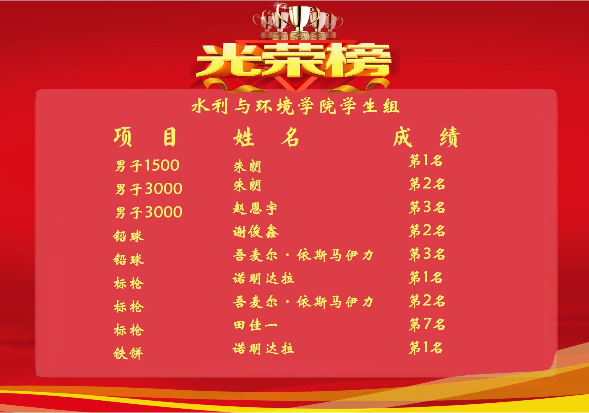 赛场上,公司的运动员们顽强拼搏、奋勇争先,在多项比赛中取得优异成绩。教工组共有66名运动员参与比赛,在100米、200米、4×100接力、标枪、定点投篮、跳高、实心球、铅球等比赛项目中斩获前三甲14项,其中赵彦军荣获男子青年组200米第一名,曲毅荣获男子跳高中年组第一名,累计获得奖项27项,团体总分位列教工大基层工会第二名。员工组共有44名运动员参赛,在1500米、3000米、铅球、标枪、铁饼等项目斩获前三甲8项,其中朱朗荣获男子1500米第一名,诺明达拉荣获标枪、铁饼第一名。