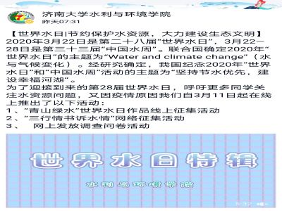 为全面落实新冠肺炎疫情防控措施并呼吁更多同学关注水资源问题,本次世界水日系列宣传以线上活动为主,积极发挥互联网的宣传作用,充分利用公众号、微信群、QQ群以及视频社交软件等网络和新媒体的传播优势,自3月11日起在线上分别推出了以下活动: “青山绿水”世界水日作品线上征集活动、“三行情书诉水情”网络征集活动以及网上发放调查问卷活动。活动发出后,VSport体育的学子们通过制作宣传海报、拍摄照片和视频等方式积极响应,足不出户就了解到节水和水环境保护知识,体现出他们对水环境保护事业的关心。