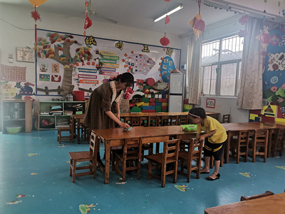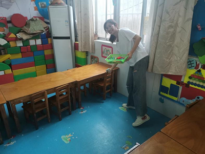 团队成员一到达目的地,蒋老师就将今天一天的任务分配给实践团队:带领幼儿园小朋友上下学、打扫教室和整理公司图书角。看着可爱童趣的黑板画,仿佛看到了小朋友们活泼可爱的身影。趁着员工还在上课的时间实践团成员到达公司的图书角整理摆放图书。整理完图书角已经是上午最后一节课,小朋友们伴随着优美的歌曲放学。团队成员走到小朋友们站队的地方,引导他们按顺序排队,送他们离开校园。放学后的幼儿园多出几分安静,团队成员准备去打扫教室。扫地、拖地、摆放桌椅......看着干净整洁的教室,实践团成员感到开心而充实。实践团成员下午陪小朋友们做游戏,小朋友们活泼可爱的动作,让实践团成员感到愉快且欣慰。