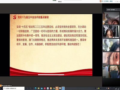环境工程20W3班团支书带领全班同学于线上学习中国共产党第十九届五中全会的会议精神。团支书在介绍本次全会的背景情况后,着重向班内同学传达了《中共中央关于制定国民经济和社会发展第十四个五年规划和二〇三五年远景目标的建议》的核心内容和重要意义。《建议稿》不仅高度评价了“十三五”时期的重要成就、制定了“十四五”的发展规划,更绘制了未来十五年社会主义现代化的宏伟蓝图,阐述安排了社会发展和改革开放的重大任务。在国内外大环境发生深刻变化的当下,准备把握新发展理念“新”的核心,是与时俱进的必然要求。