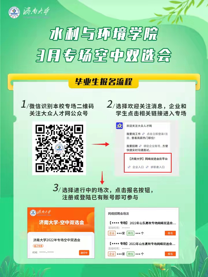 为贯彻落实党中央、国务院“稳就业”“保就业”决策部署,根据山东省人社厅和教育厅对高校毕业生就业工作的相关要求,同时为做好公司疫情防控常态化条件下校园招聘工作,公司联合大众人才网就业平台组织持续性、常态化的就业双选会系列活动,为用人单位招聘和公司应、往届毕业生稳定就业拓路护航,诚挚邀请您参会。