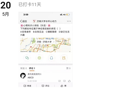 本次活动通过微博“VSport水环心动力”和微信小圈子打卡展开,由自律会心健部工作人员每天挑选心理知识及心理问题发布在微博“VSport水环心动力”中,参与人员需在活动期间关注微博“VSport水环心动力”,坚持每天认真学习微博发布的心理知识,根据自己对问题的理解和心理知识的掌握情况在评论区进行做答,并将自己答题的截图发布在微信小圈子“‘心理知识小课堂’打卡圈”进行打卡。新颖的线上活动形式大大激发了同学们的积极性,同学们踊跃参加答题,董庆春、董怡彤、李倩、倪圆圆、吴向楠、尚凯月等十一位同学坚持每天答题打卡达十天及以上,其中董庆春同学的正确率最高。