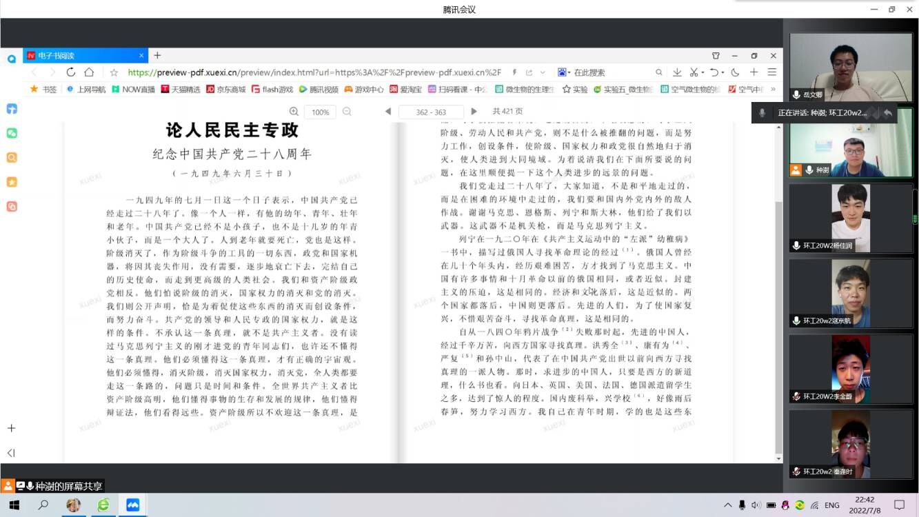 VSport体育“青年党史研学社”暑期社会实践团队由指导老师白健和种澍、岳文卿、秦逢时、寇京航、李金蔚、臧少凡、李冰语、杨佳润、张心悦九名成员组成。此次实践活动旨在提高当代青年的科学文化素质,深刻学习党艰苦卓绝的发展历史。本次实践活动主要采取线上腾讯会议的方式进行,团队成员通过观看相关视频学习探讨党的发展历程,同时研究学习习近平谈治国理政、毛泽东选集、列宁选集、马克思恩格斯合集、共产党宣言、“九二共识”会谈记录等相关文章和书籍,通过生动的文字更加深刻体会中国共产党党曲折而漫长探索之路。