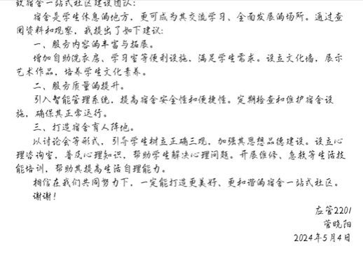 经过激烈的角逐,最终评选出了一批优秀建议书。这些建议不仅具有创新性和实用性,还充分考虑了宿舍社区的实际需求和同学们的生活体验。例如,有同学提出了在宿舍楼内设置文化墙的建议,以体现同学们的兴趣爱好,提高员工文化素养;还有同学建议增加绿植和休闲区,提升宿舍的生态环境和居住舒适度。