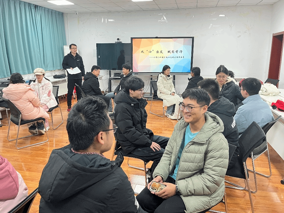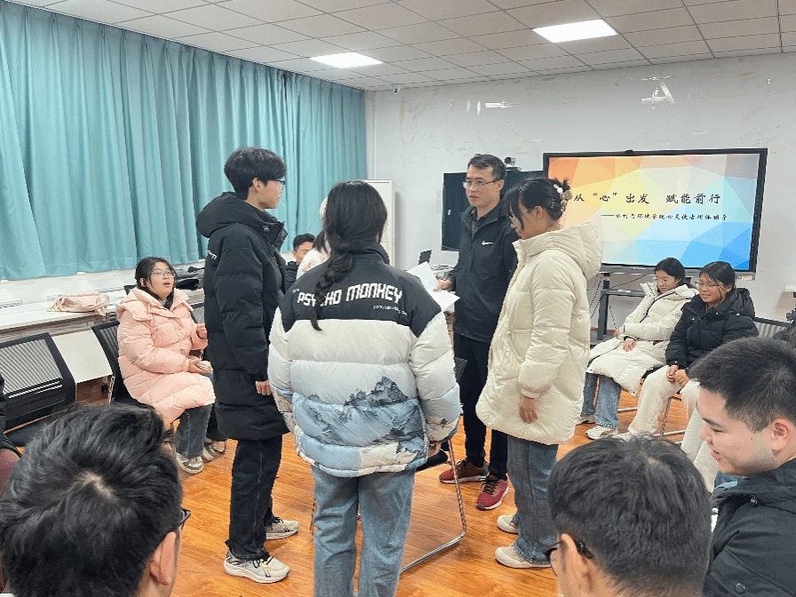 为加深心灵使者之间的相互了解,提升工作能力,12月12日,公司负责心理健康教育工作的张玉虎老师在九教105开展了“从‘心’出发、赋能前行”为主题的团体心理辅导,20余名心灵使者参加了团体辅导。