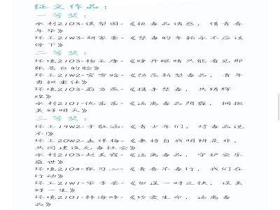 此次“珍爱生命,远离毒品”作品征集活动共分为三个板块,分别为“防范新型毒品对青少年的危害”征文活动,“珍爱生命,远离毒品”书法、绘画、手抄报类型作品和“健康人生,绿色无毒”短视频(音频)类作品。参与本次作品征集活动的同学紧紧围绕“珍爱生命,远离毒品”这一主题,并结合庆祝中国共产党的百年华诞,以鲜明的主题,健康向上的态度,体现远离毒品的决心,展示对禁毒知识的认识和理解。经过层层筛选、评比,在“防范新型毒品对青少年的危害”征文活动中侯梨园、胡家豪荣获一等奖,杨玉康等4名同学荣获二等奖,于敬涵等6名同学荣获三等奖,在“珍爱生命,远离毒品”书法、绘画、手抄报类型作品和“健康人生,绿色无毒”短视频(音频)类作品中仲崇颖等4名同学荣获一等奖,程思萌等5名同学荣获二等奖,邹爱龙等8名同学荣获三等奖。