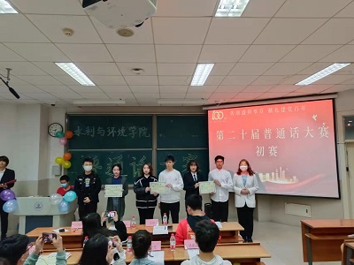 晚上七点,选手和评委准时到场。按照防疫要求,比赛期间,全员佩戴口罩。比赛开始前,两位主持人先对比赛规则和本次比赛的评委进行了简单的介绍,接着,比赛正式开始。选手们朝气蓬勃,蓄势待发!他们用最好的状态,为我们带来了听觉盛宴。他们声情并茂,带来无限的遐想;他们抑扬顿挫,带来满心的希望。伴随着音乐的旋律,他们将中国独有的汉字,进行了不同风格的演绎,让听众感受到声音的魅力,听众无一不为之动容。比赛环节圆满结束,主持人公布获奖名单。本次比赛,有三组参赛者脱颖而出,荣获普通话大赛初赛一等奖。最后,各位评委进行颁奖并合影留念。至此,本次比赛圆满结束。