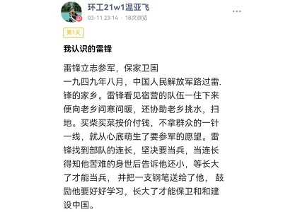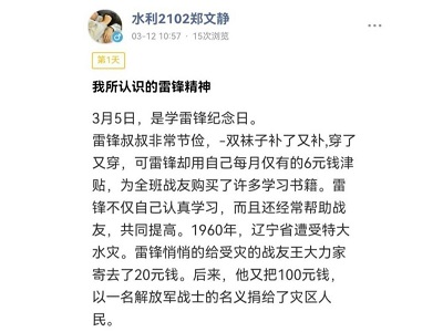 此次活动参与人员在线上通过微信小程序打卡的方式,以“我所认识的雷锋精神”为主题发布有关雷锋的小故事、生活中的活雷锋以及雷锋格言和对其感悟等内容,鼓励大家对集中体现中华民族的优良传统和反映社会主义与共产主义的价值观念与行为准则的雷锋精神进行宣传与学习。截至3月25日,按照点赞量排名,唐梦瑶、舒凡等十位同学获得奖项。