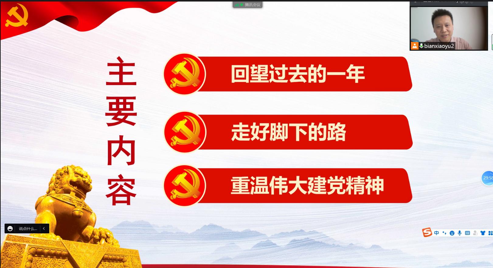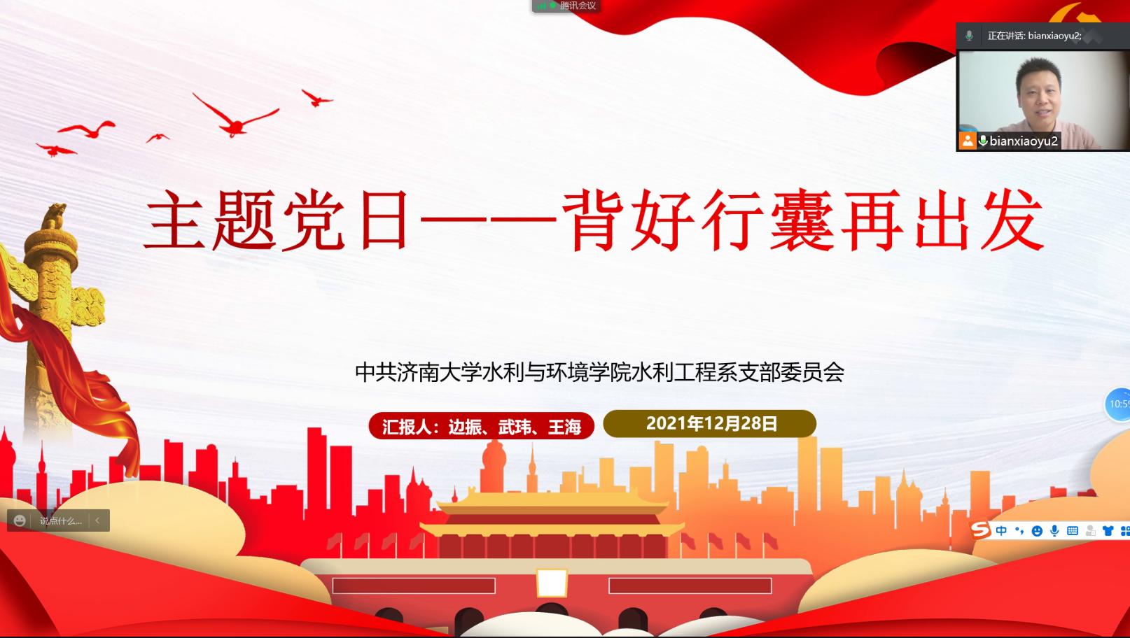 2021年12月29日,水利工程系党支部于线上举办主题党日活动---背好行囊再出发。活动从“回望过去的一年”与“走好脚下的路”两方面,围绕本年度党建工作进行了总结与问题梳理,同时以“重温伟大建党精神”为契机,对未来党建工作进行了展望与设想。会议由支部书记边振主持,水利工程系党支部全体党员参加。