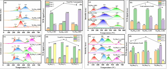 图2 NiMn-LDO和Ni1Mn1Crx-LDO催化剂的H2-TPR和NH3-TPD表征