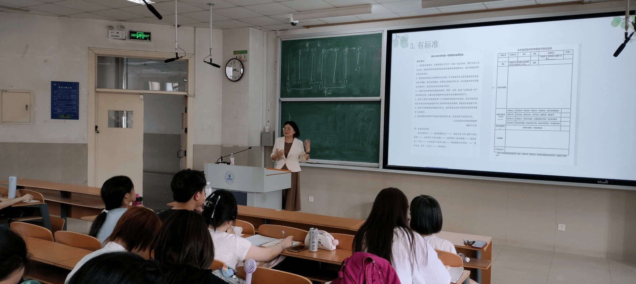 二位老师围绕班主任管理与地理教师专业素质培养两大方面内容展开深入介绍,根据理论知识与自身教育经历相结合,传授师范生教育经验,促进师范生全面发展。满霄老师就班主任管理,分享其独特的班级管理理念,详细介绍了班级管理制度的建立与执行,强调要给予员工个性化的关爱与引导,帮助他们树立正确的人生观和价值观,并着重讲解了家校合作在班级管理中的作用与重要性。武彩老师就地理教师专业素养储备开展演讲,鼓励师范生争做“四有”好老师,夯实理论知识学习,追求教育理想,做到有理想信念、有道德情操、有扎实学识、有仁爱之心,强调了作为一名优秀的地理教师应当具有的多项品质,并为同学们分享了多项有关地理教学的方式技巧。