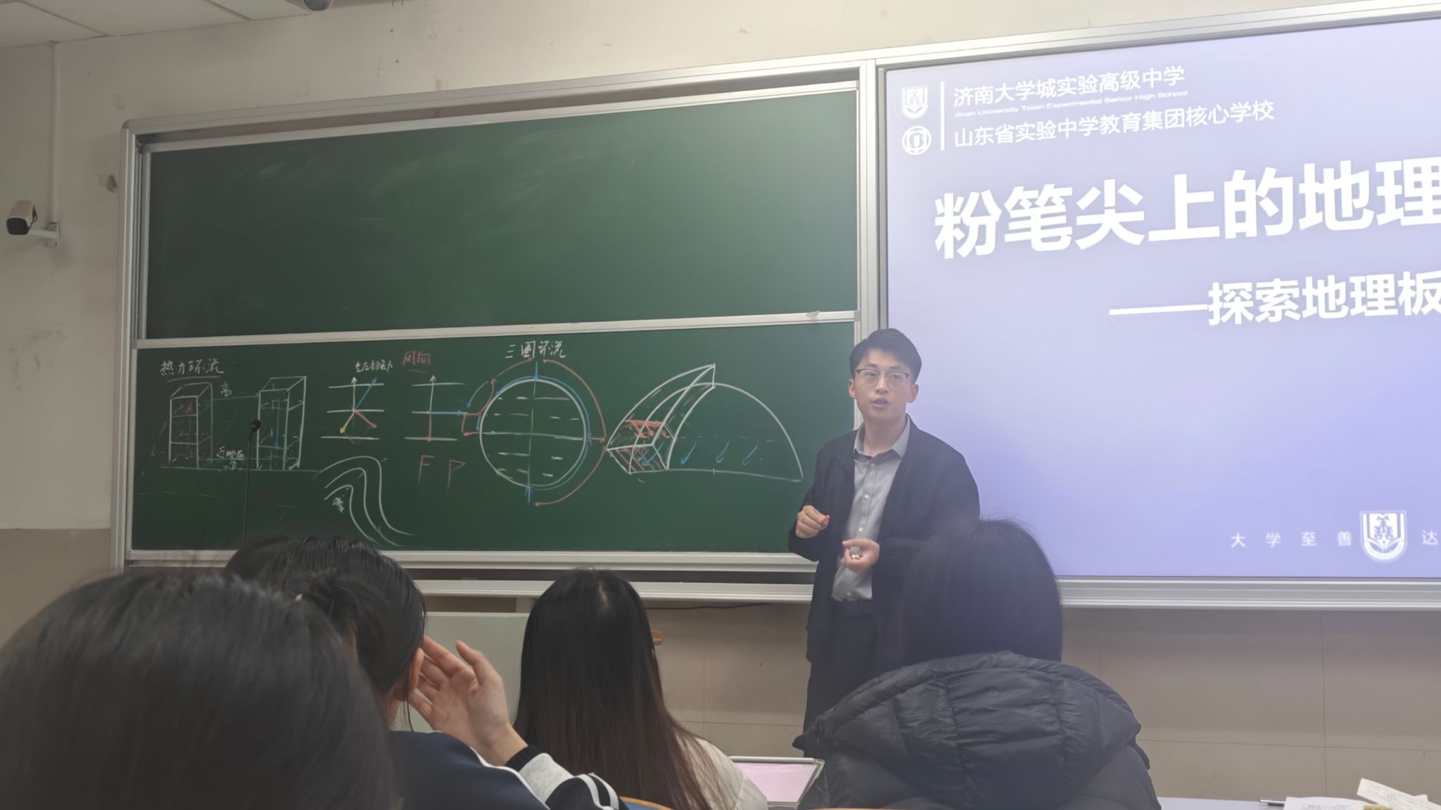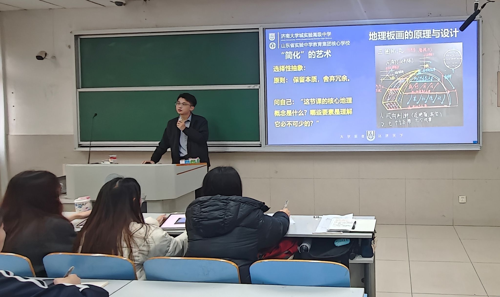 板画演示将讲座推向高潮。袁晓老师以热力环流为例,通过线条的疏密变化、色彩的巧妙搭配,生动呈现出气流运动轨迹;在绘制三圈环流示意图时,他一边讲解气压带风带的形成逻辑,一边精准落笔,赤道低气压带、副热带高气压带等关键要素跃然黑板,复杂的大气运动规律在板画的辅助下变得通俗易懂。
