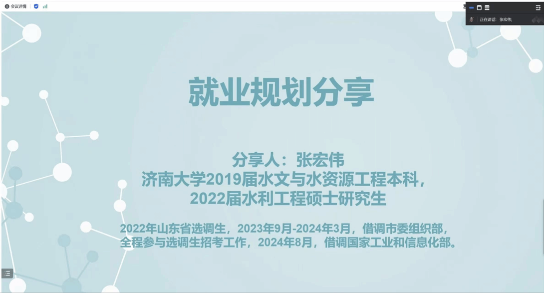 为着力提升就业指导及服务的精确度和实效性,全力支持公司有考公意向员工深入了解考公政策和备考策略,12月19日下午13:00,公司邀请2022届水利工程硕士研究生张宏伟做就业规划分享会。此次活动由公司团委书记张通主持,公司各年级员工代表参会。